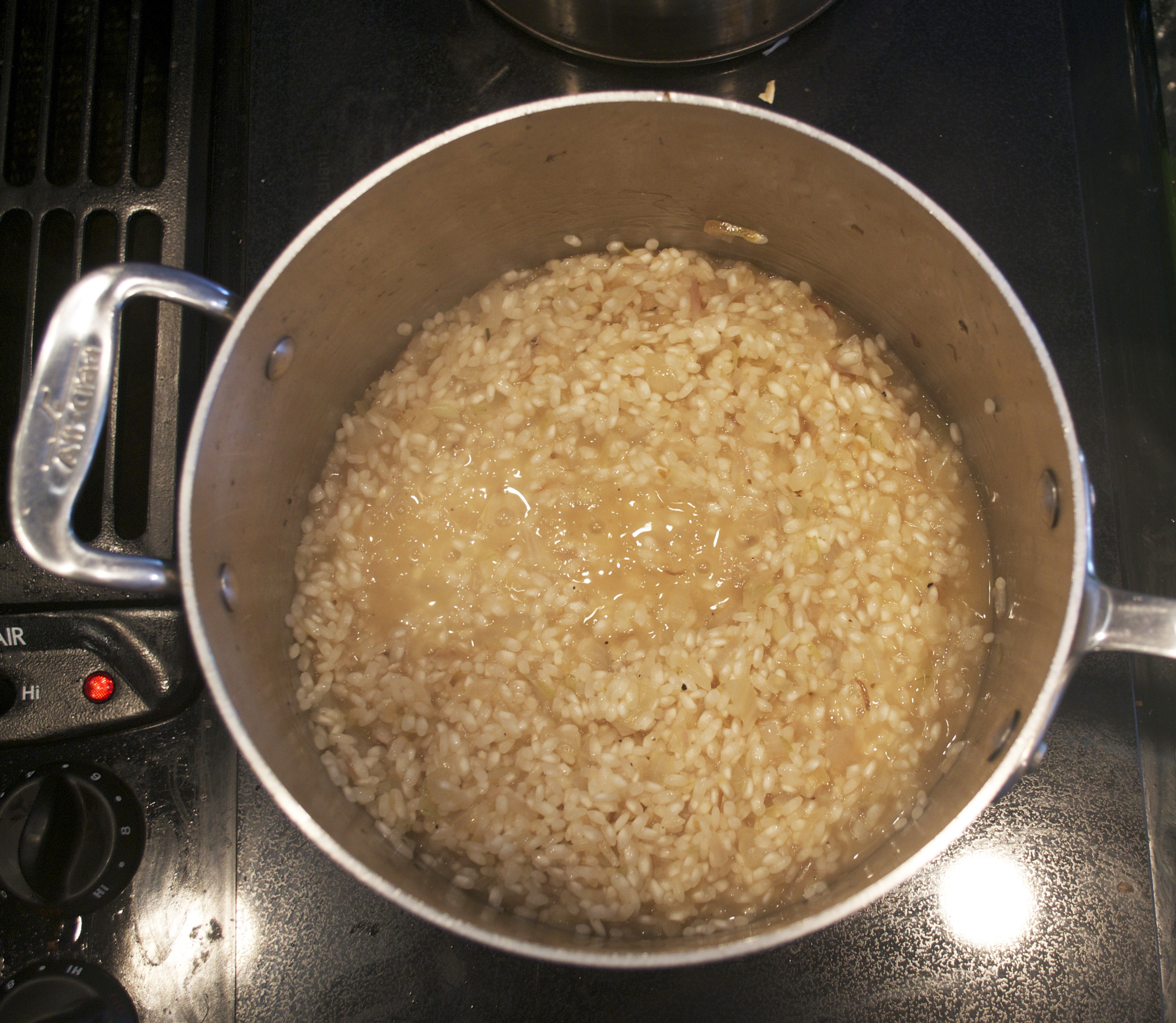 In the same pot saute the onion and shallot until translucent. Add arborio rice and stir until covered in oil/butter. Add the white wine and stir. Add 1/2 cup of the mushroom stock and stir risotto until mostly absorbed. If adding peas, now would probably be the time. Continue adding stock in 1/2 cup increments, stirring, absorbing, etc. cycle until risotto is cooked all the way through, tender and creamy.