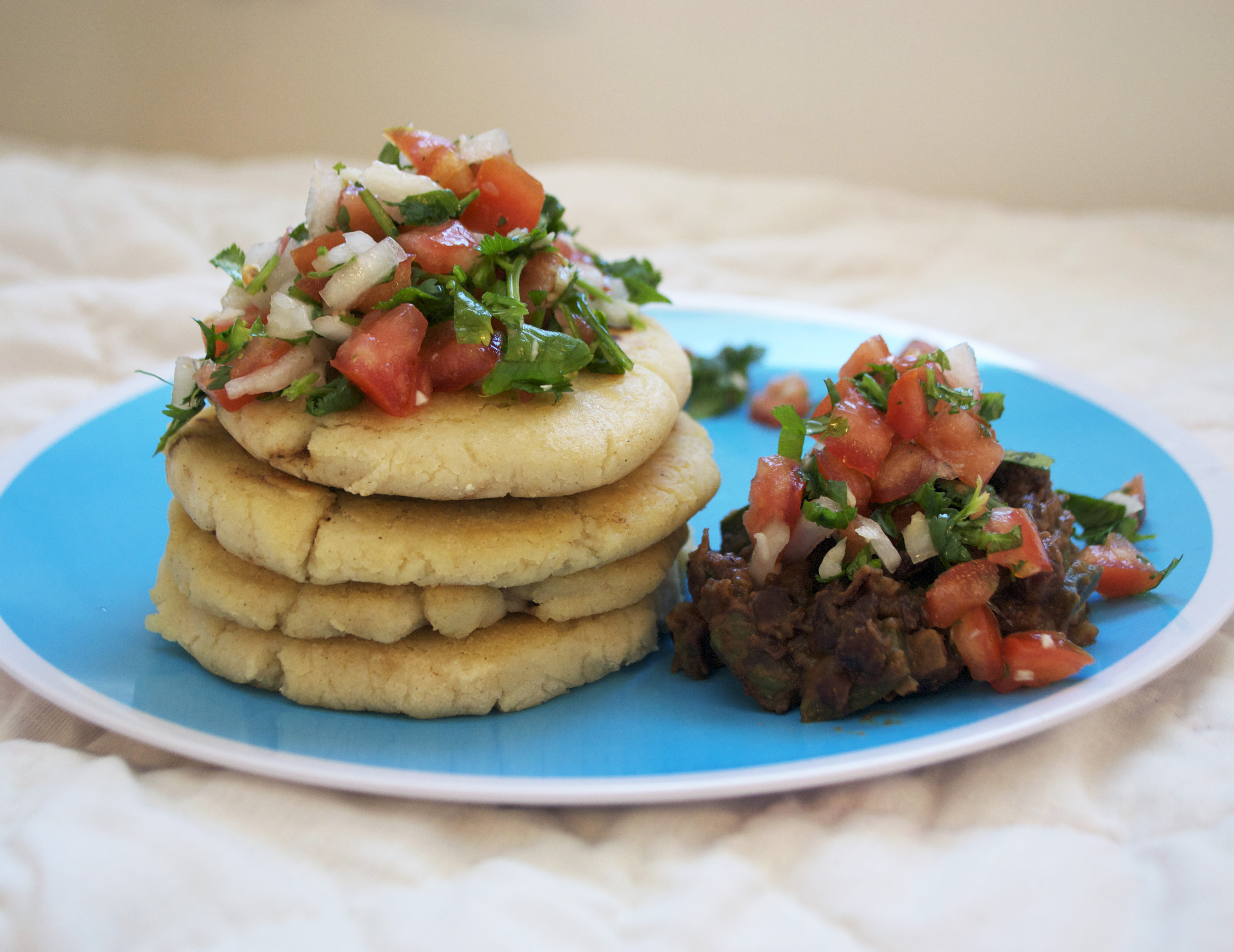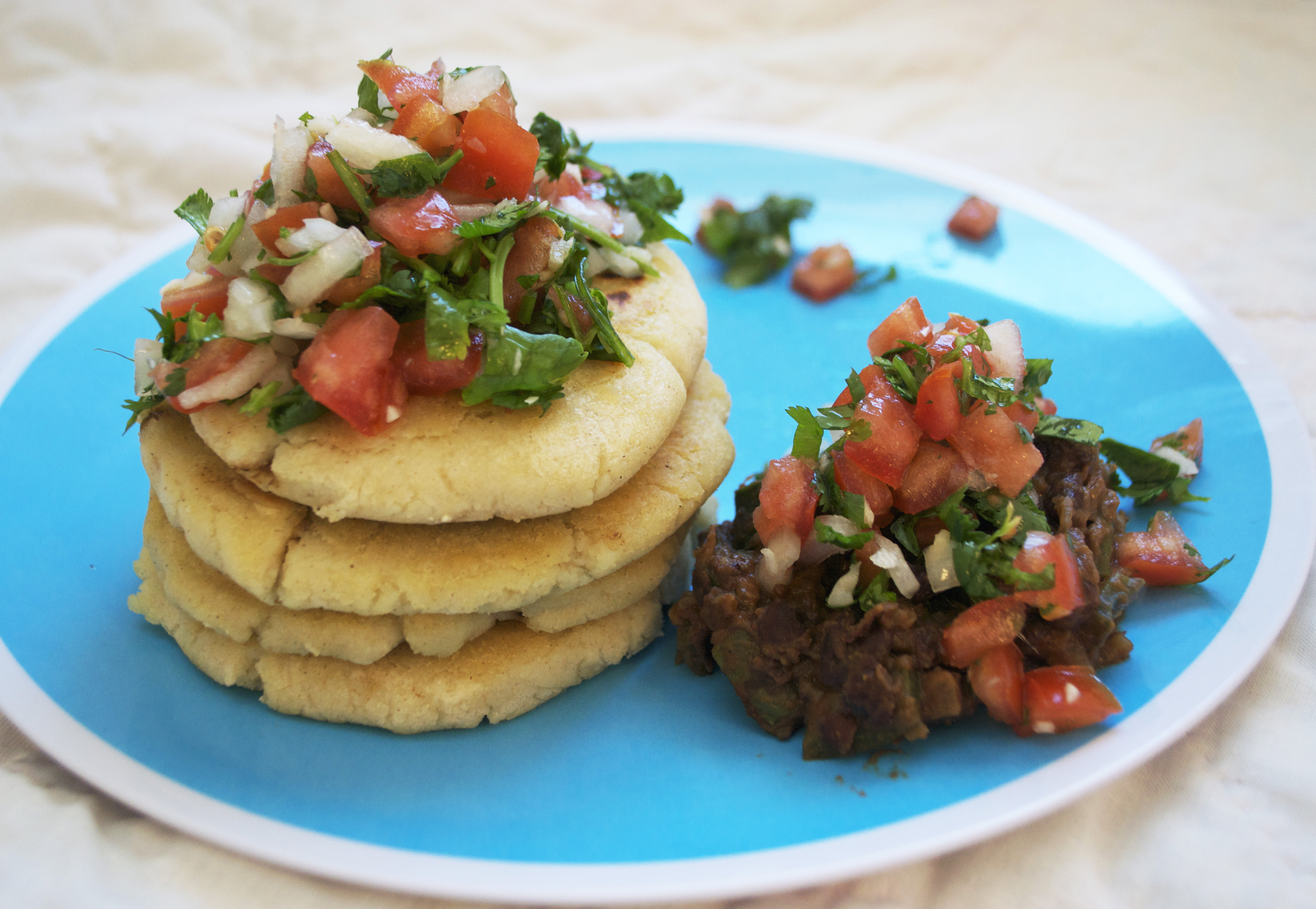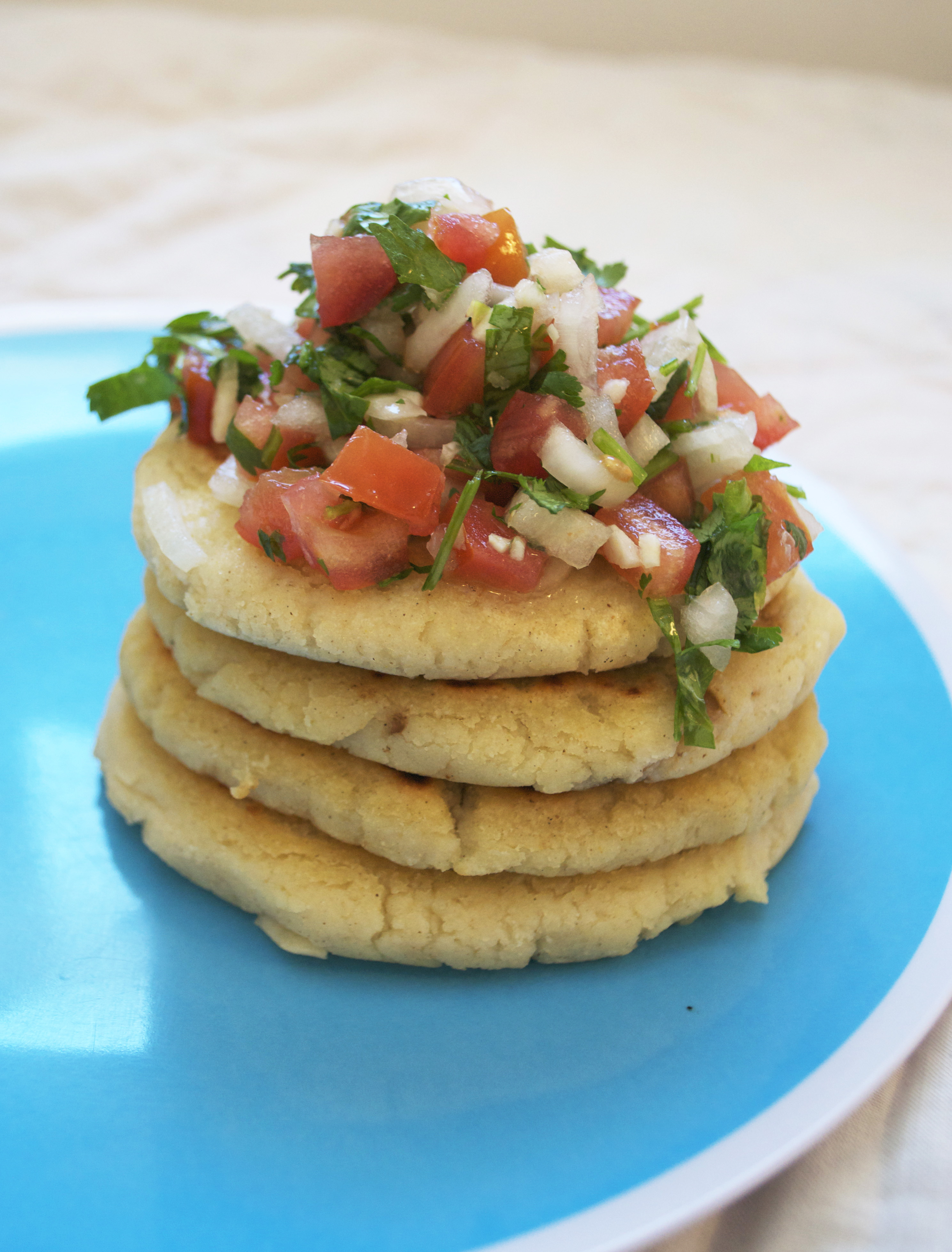 To serve: the pupusas, top with pico de gallo (as pictured), sour cream, guacamole, lime juice, hot sauce or any of your favorite accompaniments.