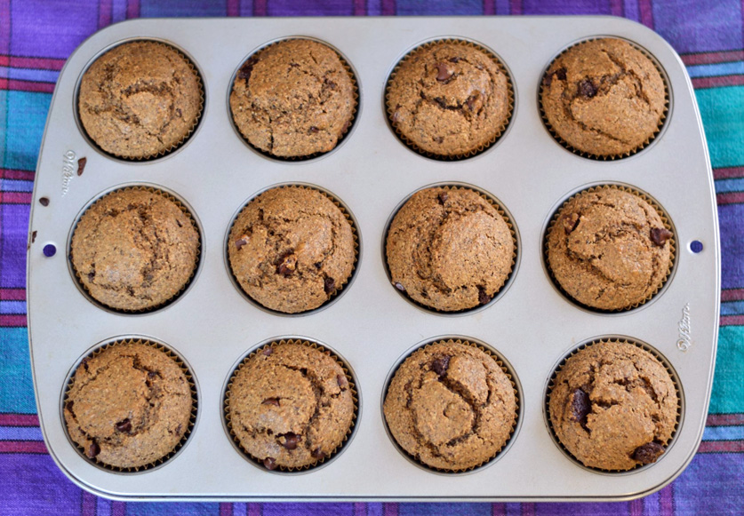*I used dairy-free chocolate – half Ghirardelli Semisweet Chocolate Chips & half chopped Ibarro Mexican Chocolate. The Mexican chocolate is full of granulated sugar & adds a nice sugary crunch to the muffins.  Feel free to use as much chocolate, or little as you like – keeping in mind that it may affect the volume of the batter.