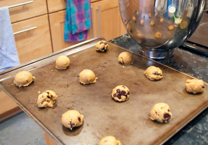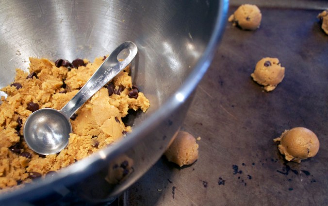Add flour, oats, baking soda & salt – slowly. Beat until well-mixed & smooth.