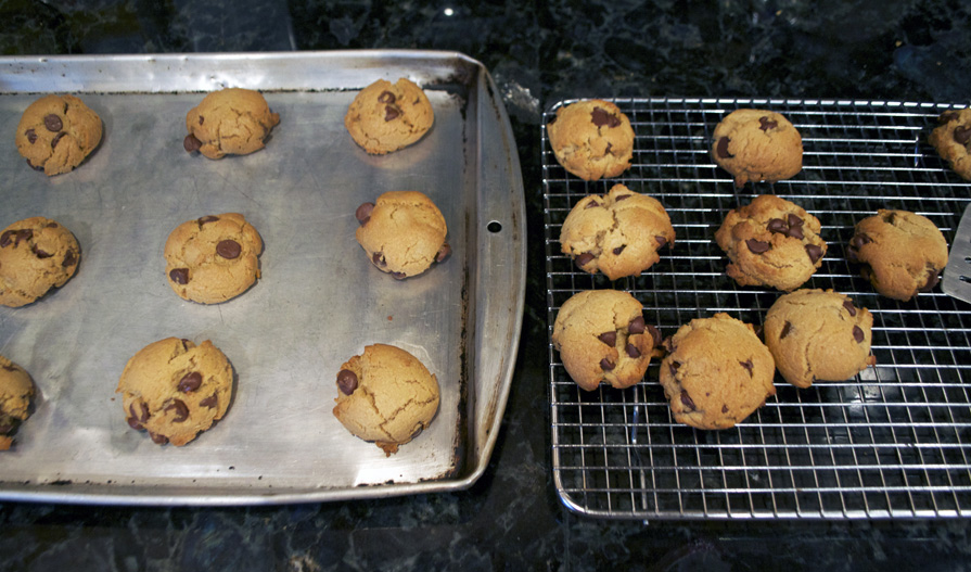 Spread chocolate chips across the surface while still hot. When the chocolate has softened/melted, after a few seconds, spread evenly.