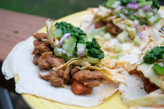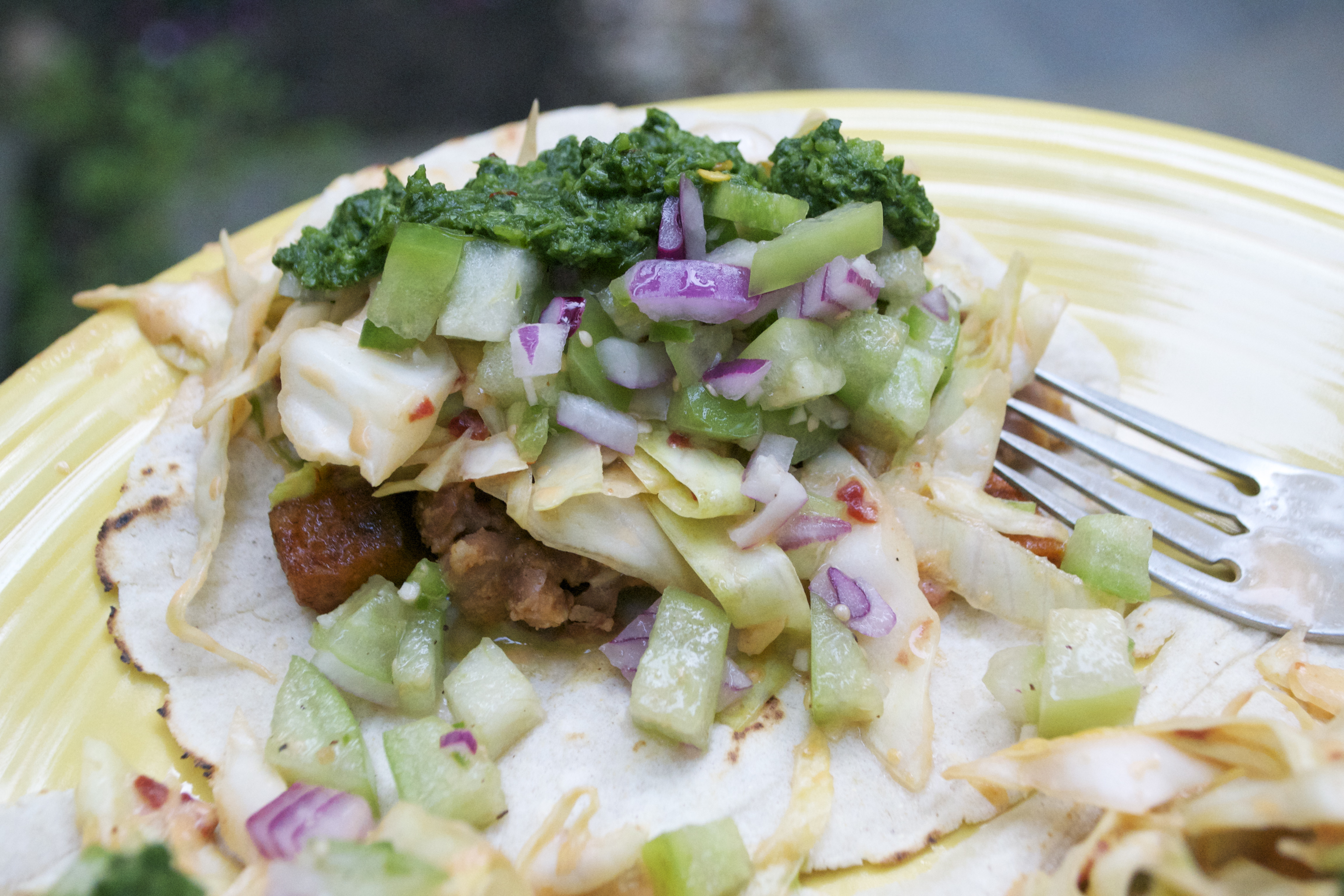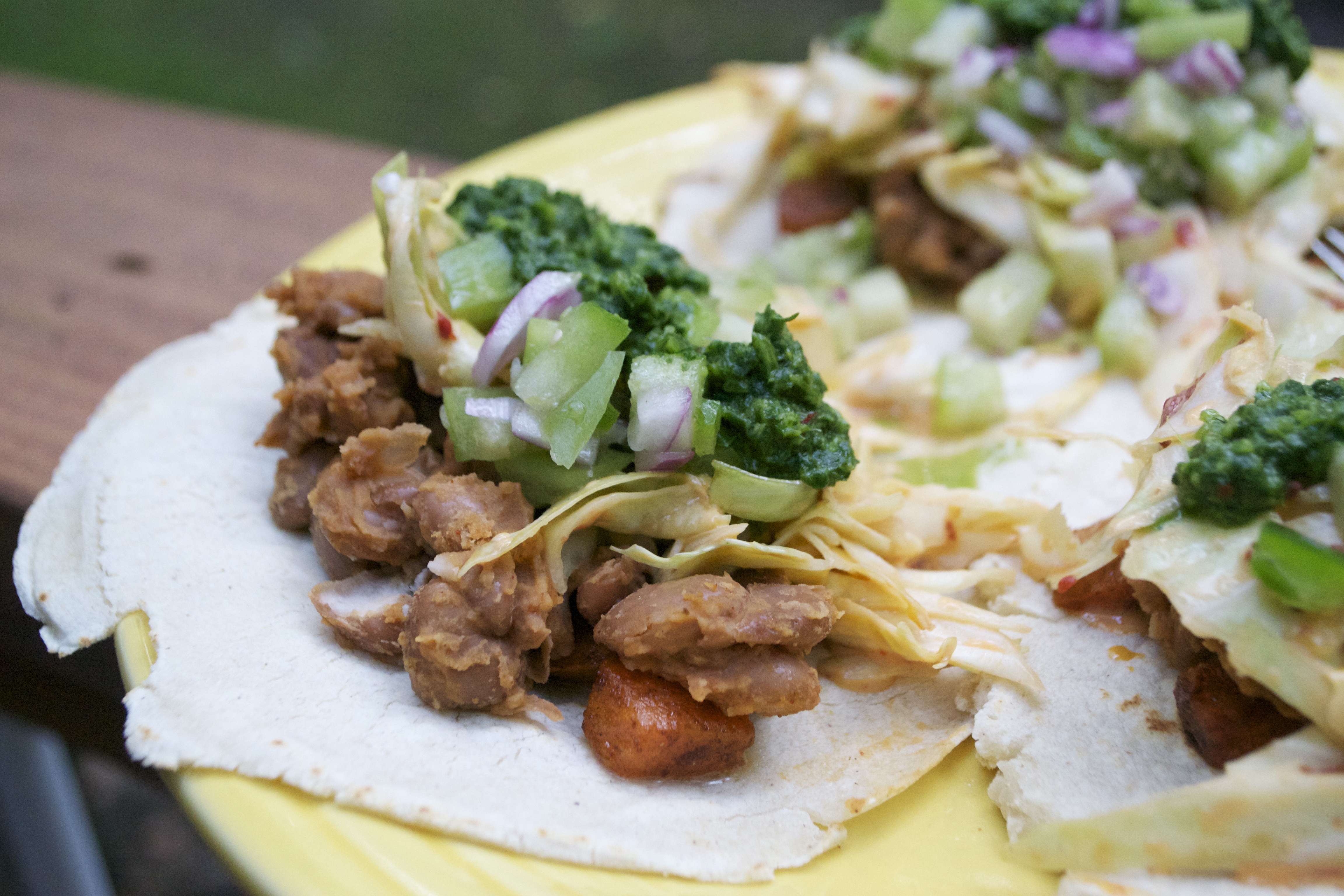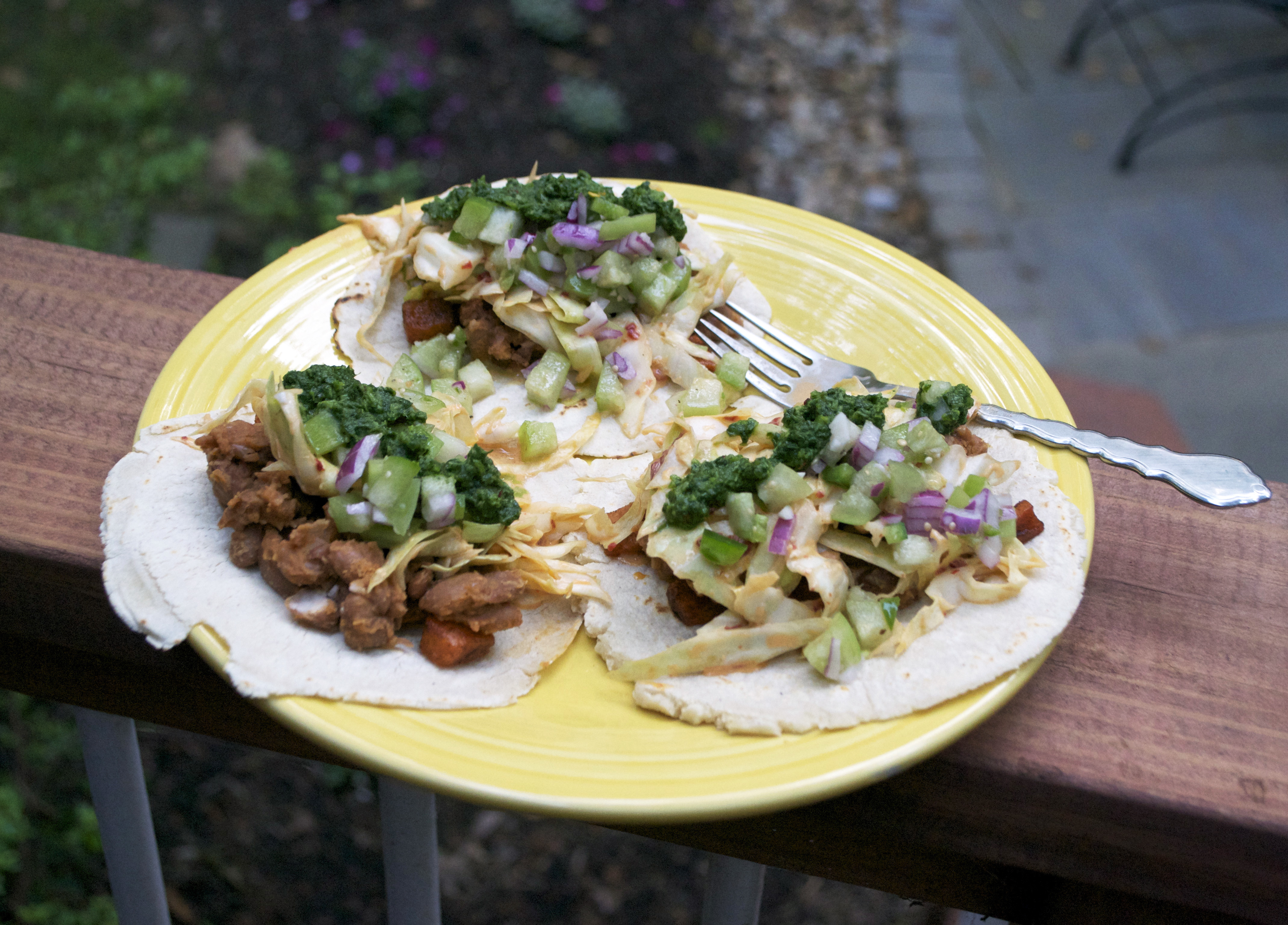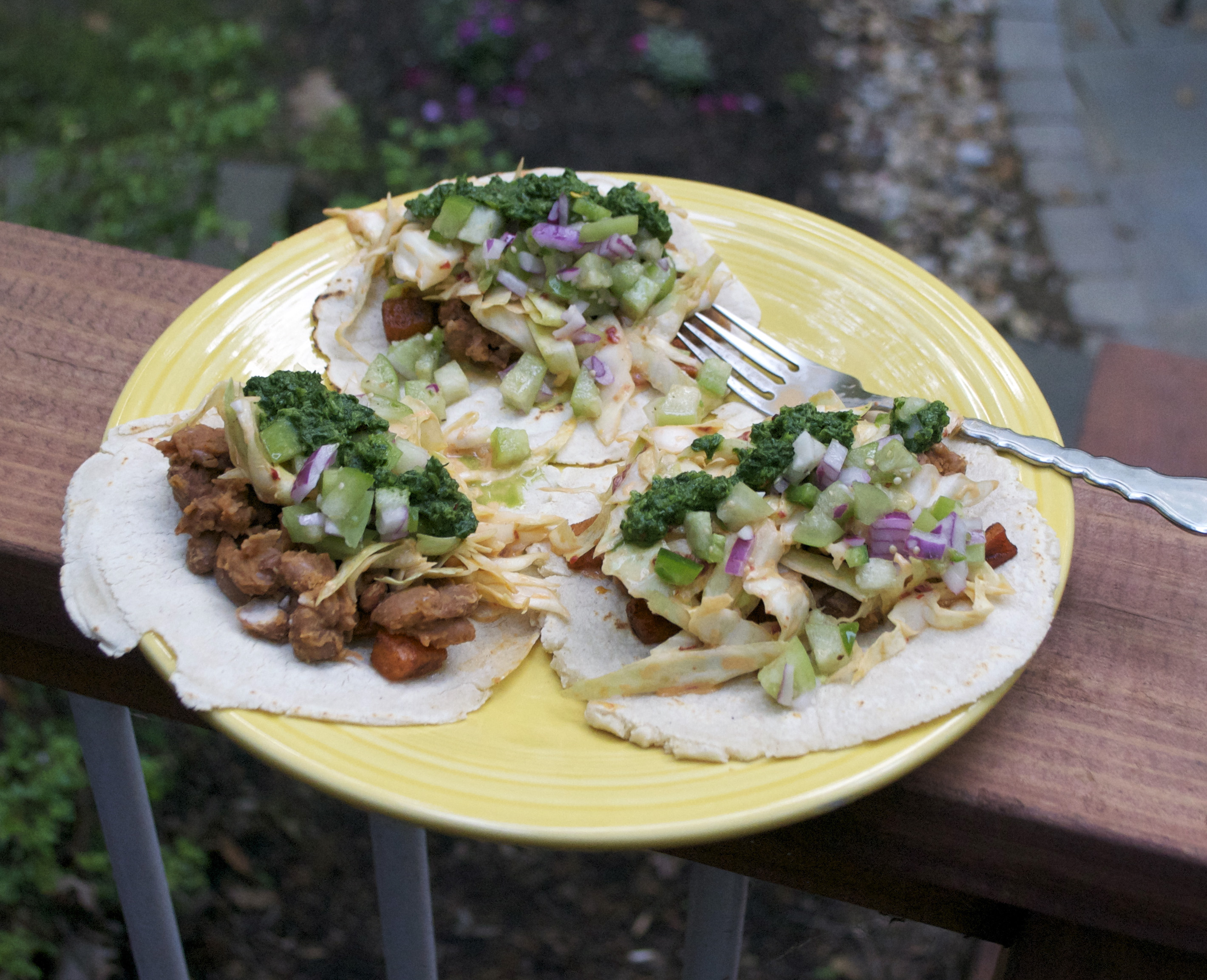 Sweet Potato, Pinto Bean, Tomatillo Tacos w/ Chipotle Slaw & Cilantro Chimichurri